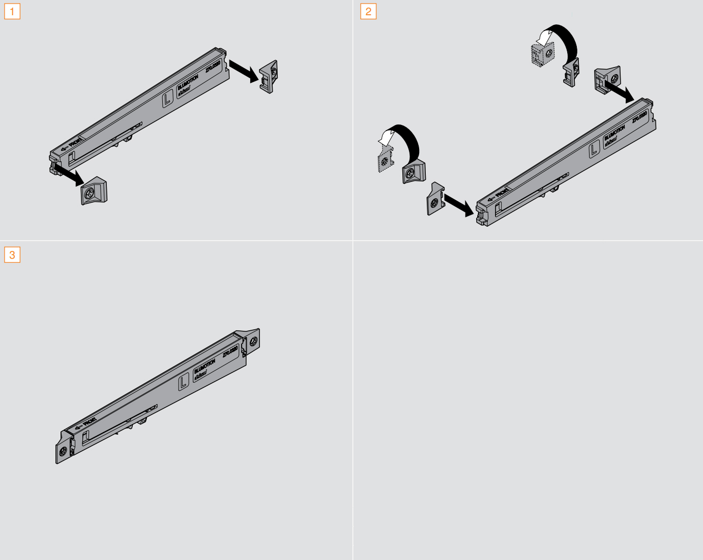 Külső csillapítás a METABOX rendszerhez. A 900 mm-es szekrényszélességig csak egy darab szükséges. A megfelelő működéshez két csavarral + egy új lyukkal kell rögzíteni az oldalfalon. A csillapító kétoldalas. Alapfelszerelésként a bal oldalfalra történő felszerelésre van előkészítve. A jobb oldalfalra történő felszereléshez a csavarfuratokkal ellátott végzáró sapkákat ki kell húzni a csappantyútestből, 180°-kal el kell forgatni és vissza kell tolni a csappantyútestbe (lásd a képet). A lengéscsillapító szürke színű, a hordozó színe a típustáblán található.