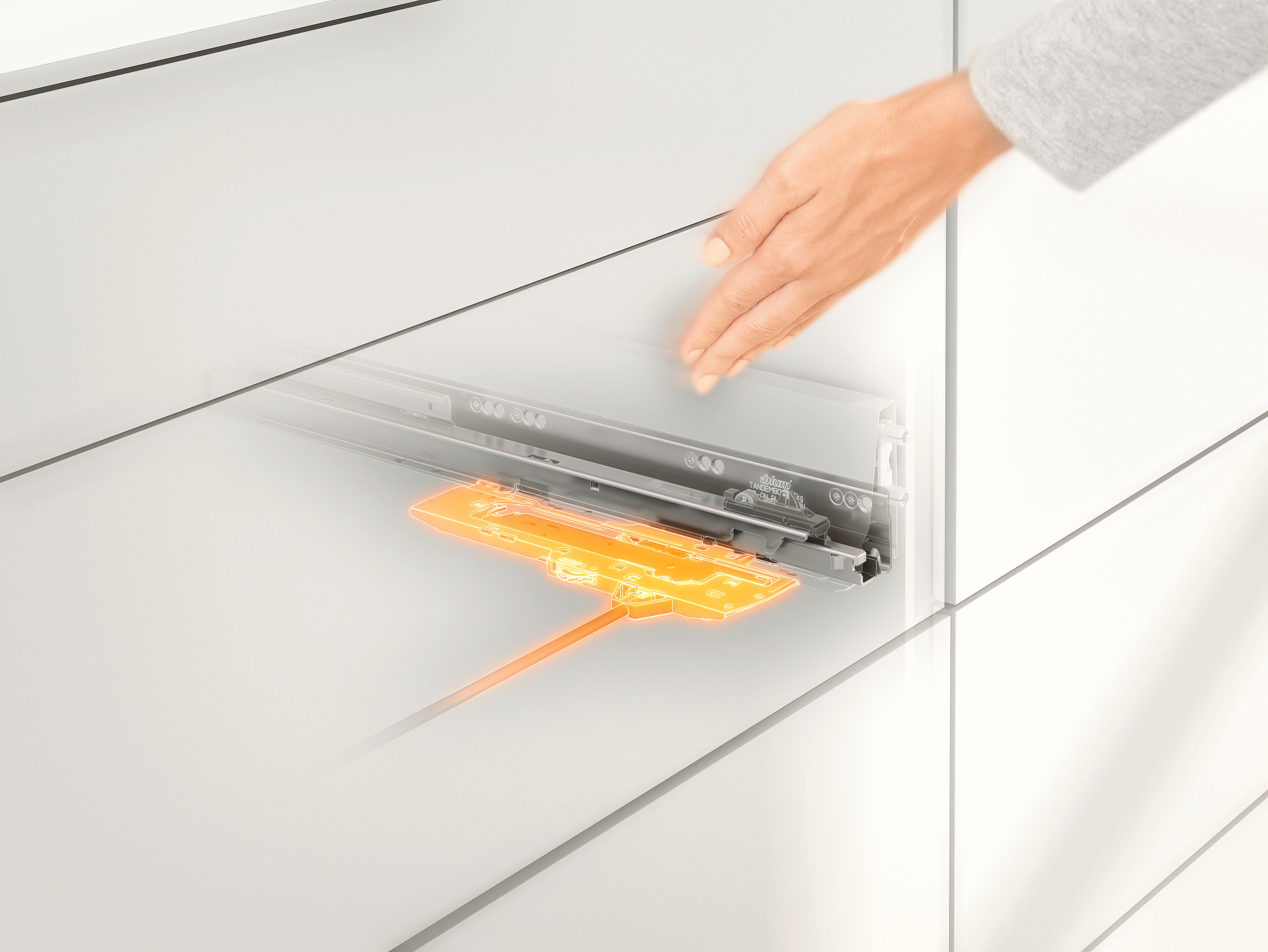 Optimalizált Tandembox korpusz profil TIP-ON Blumotion-hoz - mechanikus fogantyú nélküli nyitás és csillapítás a zárásnál. Dinamikus teherbírás 30 kg. TBX TOB modullal kell kiegészíteni (a fiók mélységének és súlyának megfelelően) , esetleg szinkronizációval.