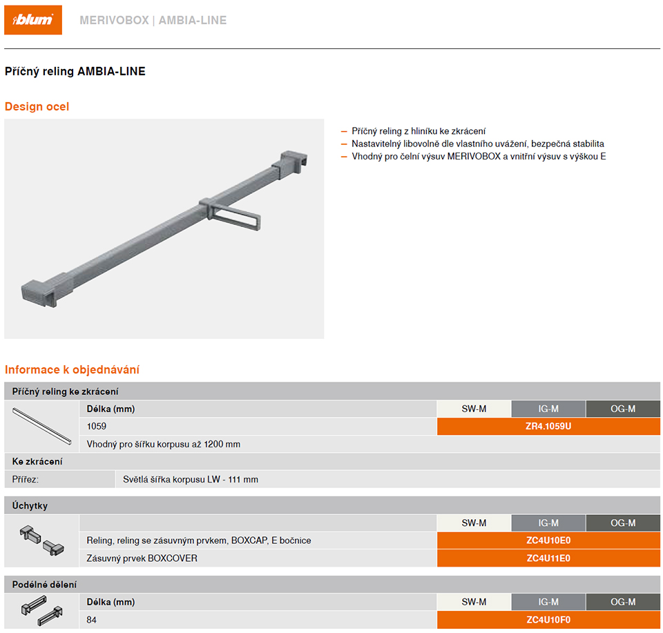 BLUM ZC4U10E0 držák příčného relingu pro reling/Boxcap MERIVOBOX, bílá, SW-M