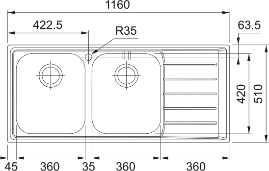 Sinks: 2 × 360 × 420 × 200 mm