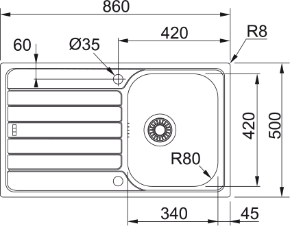 Dřez: 340 × 420 × 160 mm