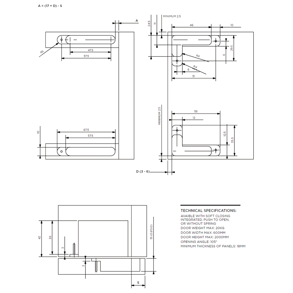 High-end és trendy desig pántok. Modern fekete design. Nagyszerű paraméterek.A zsanér és a tál bele lett marva a korpuszba és az ajtóba.csillapítós változat billenő és fogantyú nélküli mechanizmusokhoz. A dinamikus terhelhetőség 16 kg / pár. Nyitási szög 105 °. Fúrási lehetőség az ajtó szélétől K = 3-6mm. A bemart anyag minimális vastagsága 18 mm