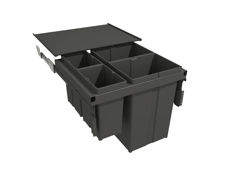 Válogató négy tartállyal 2x29l + 2x8l = 74l . 60cm-es szekrényhez. Tartalmaz egy fémpolcot a válogató felett, amely fedélként szolgál. A készlet tartalmaz sineket csillapítással Grass . Orion szürke színű.