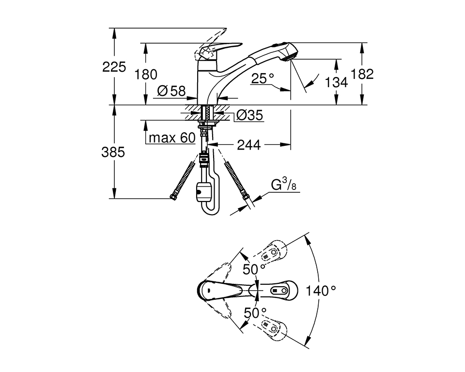 Kihúzható zuhanyozó fej,amely megkönnyíti a munkát.A csp kar forgása 140° .Felülete Króm GROHE StarLight