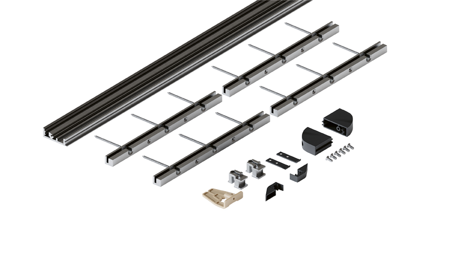 Készlet négy szárnyhoz. Tartalmazza a padló profilt, a takarósapkákat, a felhajtóelemet, a fúrósablont és az összekötő vasalatot. Eloxált alumínium, szín: ezüst.