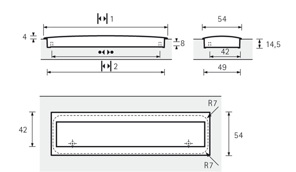 Fogantyú MISNIA hossz 180 mm, furattávolság 160 mm. Besüllyesztésre az anyagba. Felület alumínium.