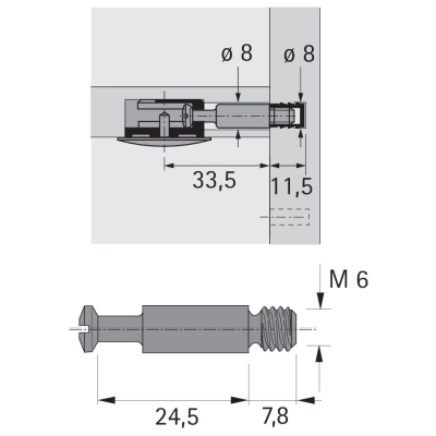 Csap Rastex 25 csatlakozó vasalathoz csavarozható, menet M6 x 7, 8 mm, a fúrás átmérője 8 mm. Méret 24, 5 mm.