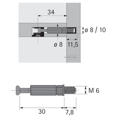 Tipli csavarozásra pro Rastex 15, menet M6 x 7, 8 mm, rögzítés méret 30 mm, cinkezett acél, fekete műanyag.