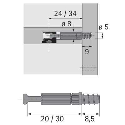 Tipli csavarozásra. eurócsavar menet, a fúrás átmérője 5 mm. befogás méret 30 mm. cinkezett acél, fekete műanyag.