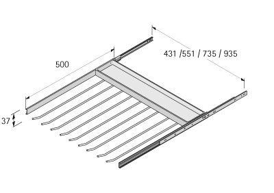 Méret 735 x 500 x 37 mm, rúd csúszásgátló profillal, szerelés a korpuszok oldala közzé. felület: porszórt ezüst.