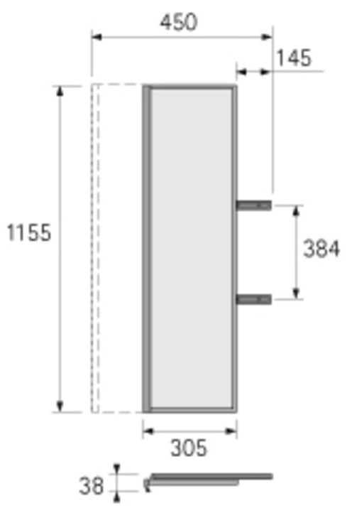 Szerelés a korpusz oldalára. Szerelhető a már meglévő korpuszba is. Használható, mint jobbos vagy balos. A mágneses profil gátolja a véletlen feldöntést. A sín mélysége 456mm. Magasság 1155mm. A keret és a fogantyú profil: alumínium. Felület: antracit. A szett összetétele:1 db tükör, 1 db sín.
