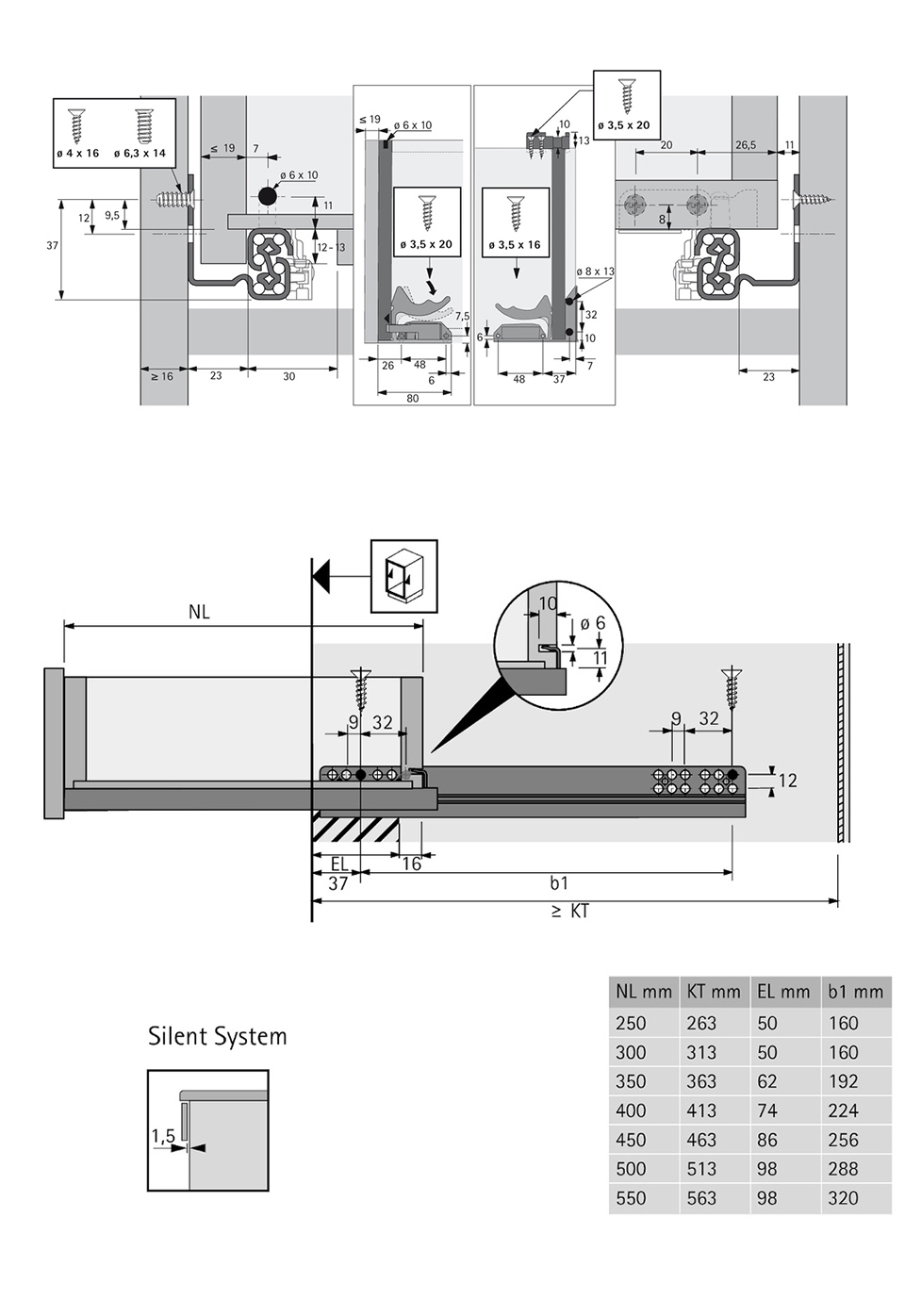Částečný výsuv Quadro 25 s integrovaným tlumením Silent System pro tloušťku boků zásuvky až 19mm. Montáž nasunutím se spojkami a seřízením výšky bez použití nářadí. Nosnost 25kg; vestavná šířka EB23; minimální hloubka korpusu 563mm.