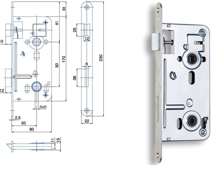Építészeti bevájható zár Hobes 540 WC kulcshoz, mélység 80mm, tengely távolságok 50mm, furattávolság 90mm. Felület cink fehér. Egy csukásra, nyílásokkal az osztott lemezekre. A front mérete 230 x 22, dió 6x6 mm.