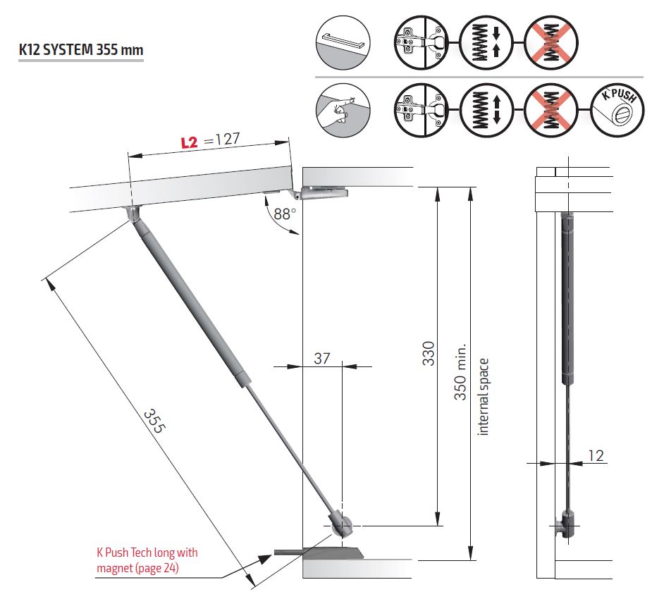 Gázrugó felnyíló K12 automatikus teljes nyitással. Az ajtó magassága: 400-600mm. Teherbírás max. 8kg (2 db)