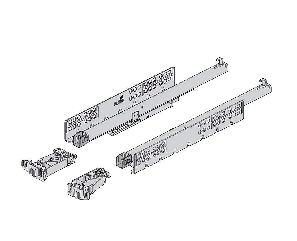 Kompletní sada kování pro výrobu dřevěné zásuvky s celovýsuvy Quadro YOU. Sada obsahuje pár výsuvů a pár čelních spojek. Čelní spojky umožňují výškové nastavení zásuvky bez nářadí.