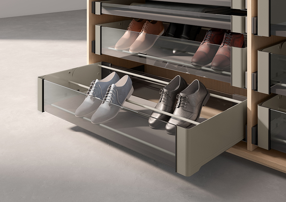 Komplet kování pro sestavení zásuvky Conero v barvě champagne gold, včetně výsuvů a čelní i zadní výplně. Součástí je také vklad na boty. Komplet lze doplnit o distanční podložku, nebo dekorační podložku ke krácení. Dno je nutno vyrobit.