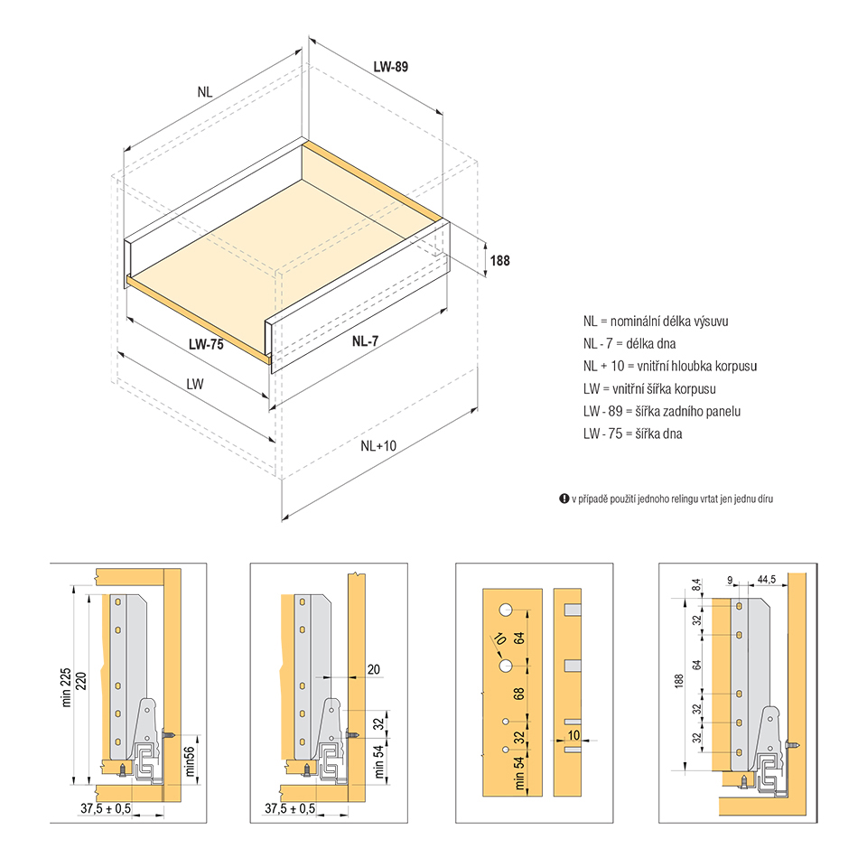 Fióksín csillapítással és üreges oldalfallal, 1 pár szögletes magasító korláttal. Hossz: 270mm, magasság: 204 (225mm). Teherbírás: 35 kg-ig. Szín: szürke. Minden, amire szükség van a fiók front összeállításához ebben a készletben található. A belső fiókhoz front lapot szükséges rendelni.