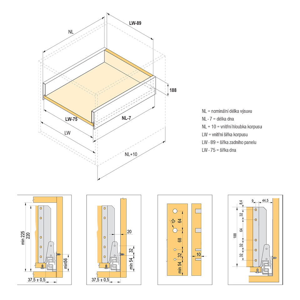 Fióksín csillapítással és üreges oldalfallal, 2 pár szögletes magasító korláttal. Hossz: 550mm, magasság: 204 (225mm). Teherbírás: 35 kg-ig. Szín: fehér. Minden, amire szükség van a fiók front összeállításához ebben a készletben található. A belső fiókhoz front lapot szükséges rendelni.