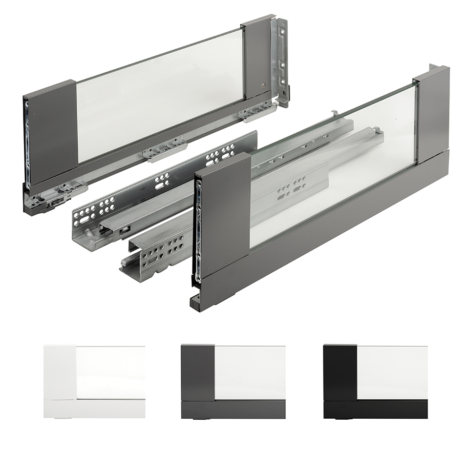 Teljes készlet keskeny (13mm) üreges oldallal és csillapított belső szinkronizálással rendelkező fiók sínekkel. Terhelhetőség 40 kg-ig. A fiókok élettartama minimálisan 100.000 ciklus. Függőleges és vízszintes fiókfront beállítás. Lehetőség van a teljes fiók dőlésszögének beállítására az oldalfal hátsó részén (a front dőlésszög beállítására szolgál). A fenéklap és a hátlap gyártásához 18 mm vastagságú anyagot kell használni.