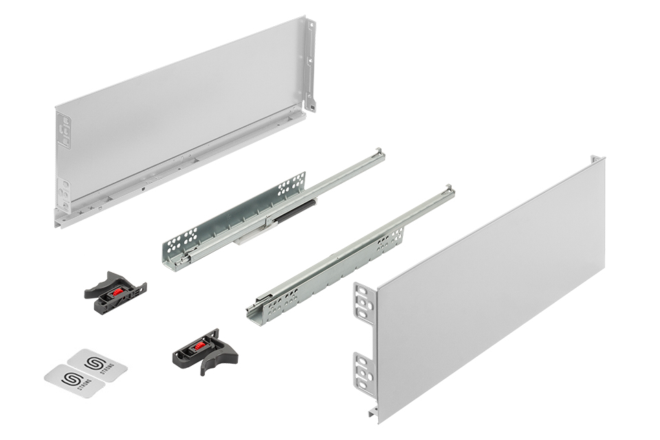 Komplett vasalat gazdaságos boxfiók összeállításához rendkívül vékony (Single wall) 1 mm vastag fém oldalfallal és rejtett, csillapított fiókcsúszókkal. Az előlap mellett szükséges még az fenéklap és a hátlap méretre vágott elemeinek kiegészítése (azonos szélesség), 16 mm vagy 18 mm vastag lapanyag használható.