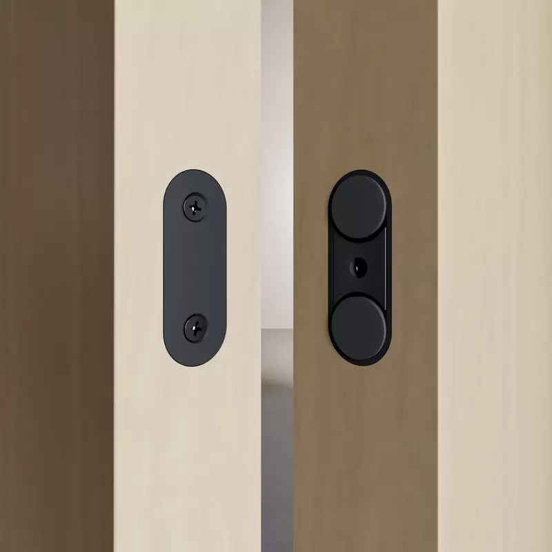 Sada kování pro dvě křídla s bezfalcovými závěsy (3 ks) a magnetickou aretací (2 ks). Verze bez spodního vedení. Pro výšku dveří max. 2400mm, nosnost 40kg/1 křídlo. Tloušťka materiálu 30 - 45mm. Barva černá (práškově lakovaná).
