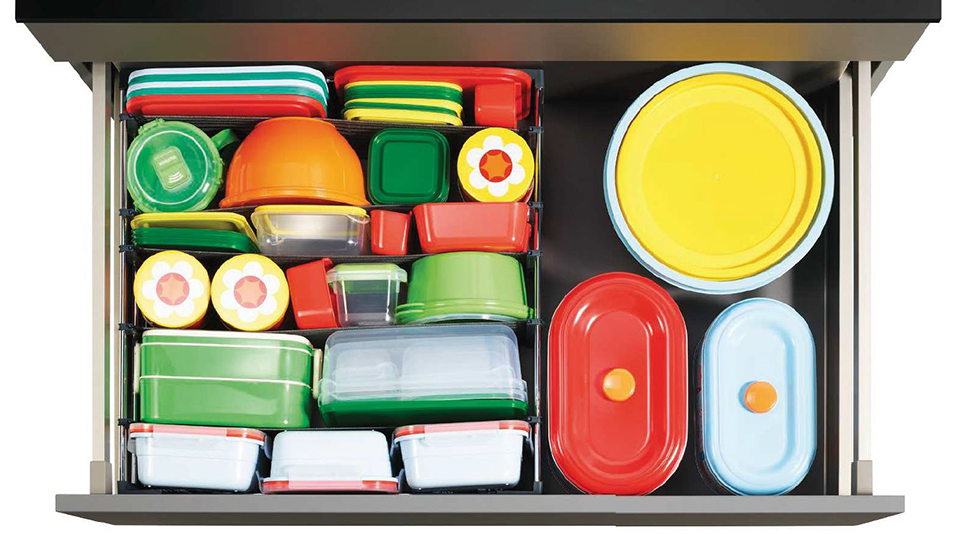 A belső fiókok szervezésének rendszere. A szabadalmaztatott nesttex anyagból készült rugalmas válaszfalaknak köszönhetően az átláthatóság és a szervezés gyerekjáték. Nincs többé szükség műanyag fedőlapra a fiók alján, minden a szem előtt van és azonnal elérhető. A válaszfalak moshatóak mosógépben. A telepítés nagyon egyszerű és minden típusú fiókra alkalmas, minimum 500 mm mélységű. A szervező méretei D = 472, W = 472/520, H = 130 mm A SpaceFlexx-et 2020-ban konyhai innovációnak választották, és emellett a konyhai felszerelések kategóriájának legjobb termékévé is megkapta a „Best of the Best” arany pecsétjét.