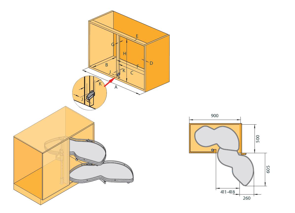 Arena STYLE kosár szett (lapos drót) króm az alsó sarokszekrény megoldására (úgyn. vak sarok). Anti-slip alj, csúszásgátló felülettel.Korpuszhoz: 900 mm. A csillapítót a külső karra szereljük. A korpusz belső mérete: szélesség: 860, mélység 500, magasság: 600-750 mm esetleg 720-900 mm. Az ajtó mérete: 411-418mm. Szerelő rúd + rögzítés oldalra - 160132 (600-750 mm), Külső csillapító a balos változatra - 318464. A polc teherbírása 20kg.