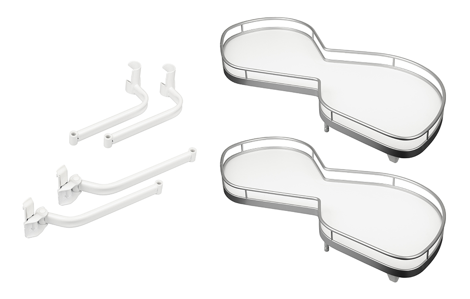 Arena CLASSIC polc szett, króm alsó sarokszekrény megoldására (úgyn. vak sarok) LeMans II. Anti-slip csúszásgátló felülettel. A LeMans II-höz hozzáadható önálló csillapító, amely a polcot behúzza, a zárásnál csillapít és óv a csapódástól. 900mm korpuszra. Csillapító szerelése a külső karra. A korpusz belső mérete: szélesség: 860, mélység 500, magasság: 600-750. Az ajtó minimális mérete 411-418mm. Szerelő rúd + felerősítő elem az oldalra - 160132, hozzáadható csillapító a jobbos változatra - 318463. A polc teherbírása 25kg.