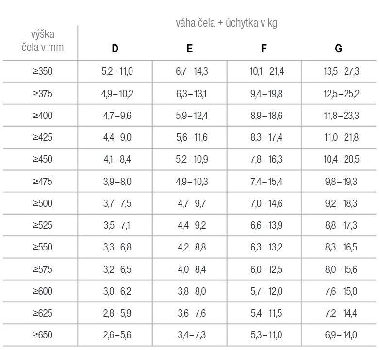 Ajtófront magasság 350mm és súly 5,2 - 11,0kg. Ajtófront magasság 375mm és súly 4,9 - 10,2kg. Ajtófront magasság 400mm és súly 4,7 - 9,6kg. Ajtófront magasság 425mm és súly 4,4 - 9,0kg. Ajtófront magasság 450mm és súly 4,1 - 8,4kg. Ajtófront magasság 475mm és súly 3,9 - 8,0kg. Ajtófront magasság 500mm és súly 3,7 - 7,5kg. Ajtófront magasság 525mm és súly 3,5 - 7,1kg. Ajtófront magasság 550mm és súly 3,3 - 6,8kg. Ajtófront magasság 575mm és súly 3,2 - 6,5kg. Ajtófront magasság 600mm és súly 3,0 - 6,2kg. Ajtófront magasság 625mm és súly 2,8 - 5,9kg. Ajtófront magasság 650mm és súly 2,6 - 5,6kg.