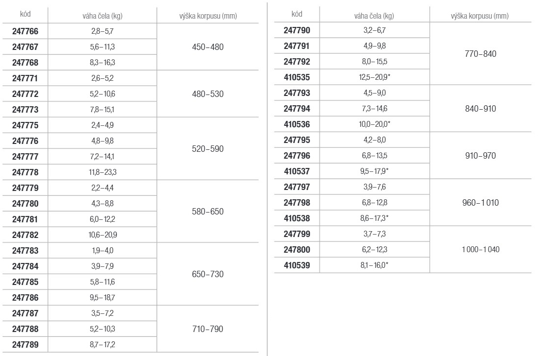 | Korpusz magassága (mm) | 650 - 730 |