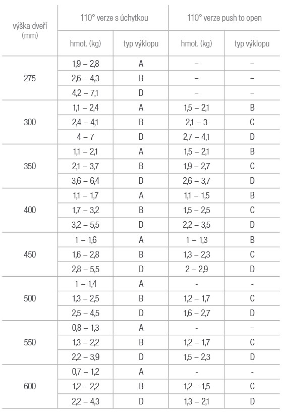 Typ a barva uvedena v názvu produktu. Úhel otevření 75, 90 a 110°.