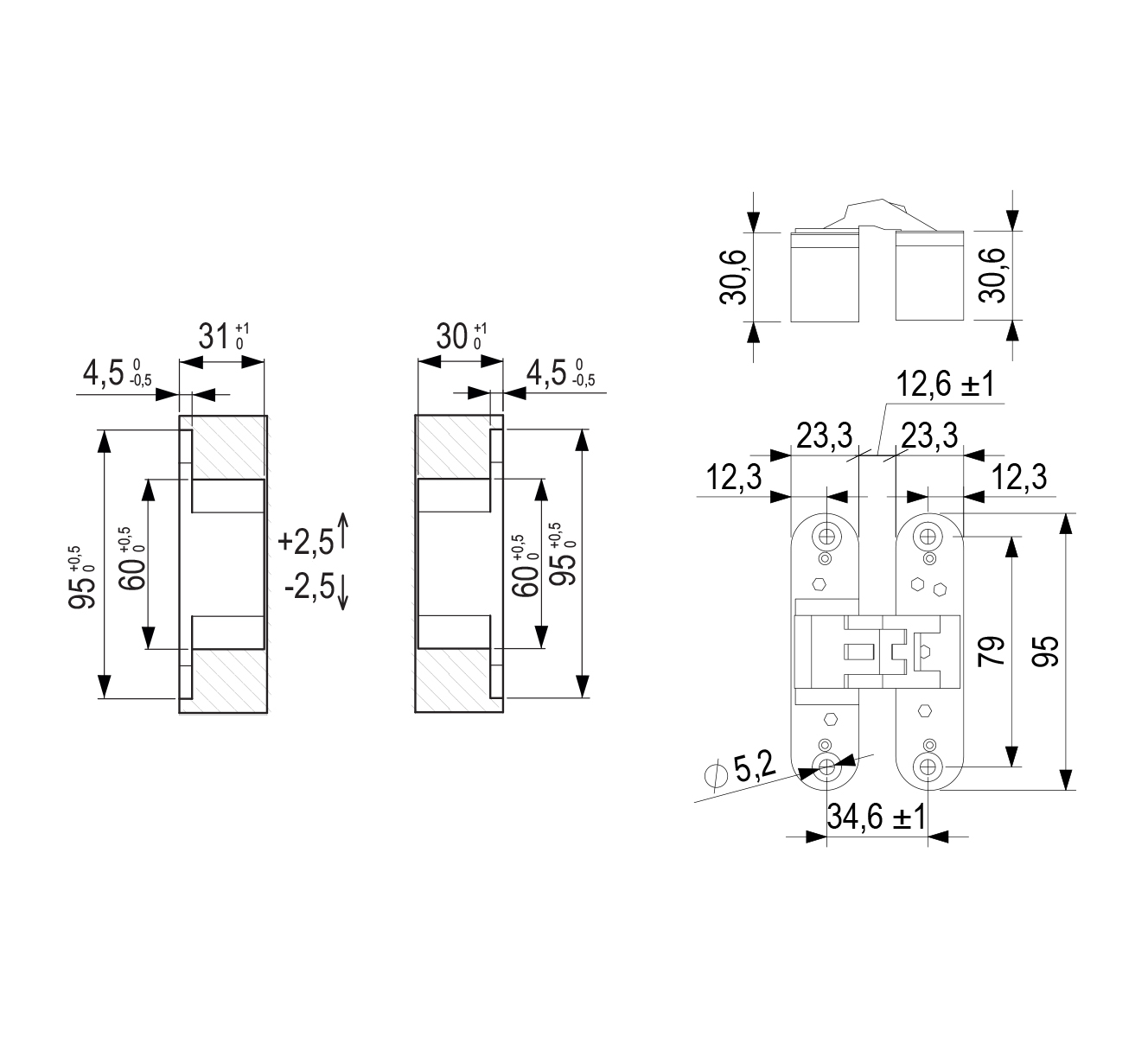 Pánt falc nélküli ajtókra 3D állítási lehetőséggel . magasság állítás +/-2,5mm, előre hátra +3/-2mm, oldalra +/- 1mm. Az ajtó maximális teherbírása 45 kg 2 db pántra (60 kg 3 db-ra). A pánt tűzvédelmi kivitele ANSI/UL 10C szabvány szerint. Szerelő sablon 256045 (keret) + 256048 (betétek)