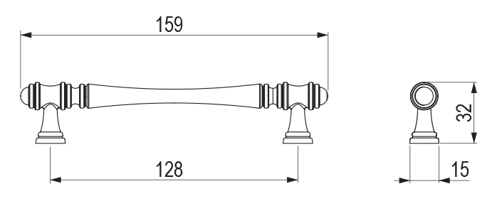 Fém fogantyú furatközzel 128mm, teljes hossza 159mm. Szélesség: 15mm Magasság: 32mm