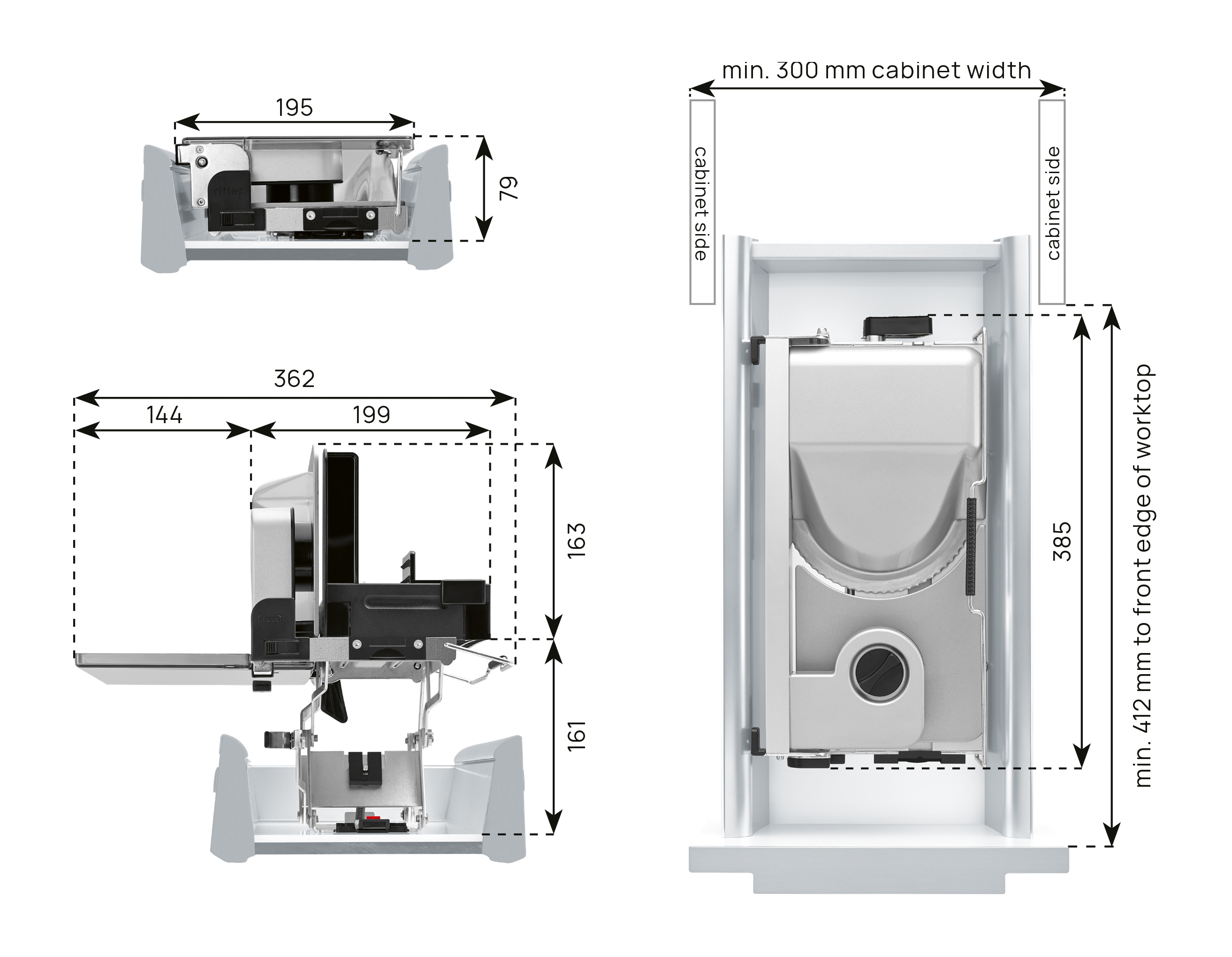 Univerzális beépíthető szeletelő. Beépíthető konyhafiókokba, amelyeknek a szélessége 30 cm! M: 79 mm Szél.: 195 mm Mély.: 385 mm