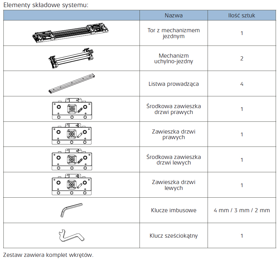 Két ajtóhoz való szerelvénykészlet egy szinten. A szekrény belső szélessége 1150 - 1750 mm, az egyik szárny szélessége 600 - 900 mm, a szárny magassága max. 1000 mm, a szárny max. súlya 20 kg. Anyagvastagság 15 - 22 mm. A készlet tartalmazza az ajtónyitáshoz szükséges összes szerelvényt. A mozgatható mechanizmussal ellátott vezető a padlóra vagy a padló alá szerelhető.