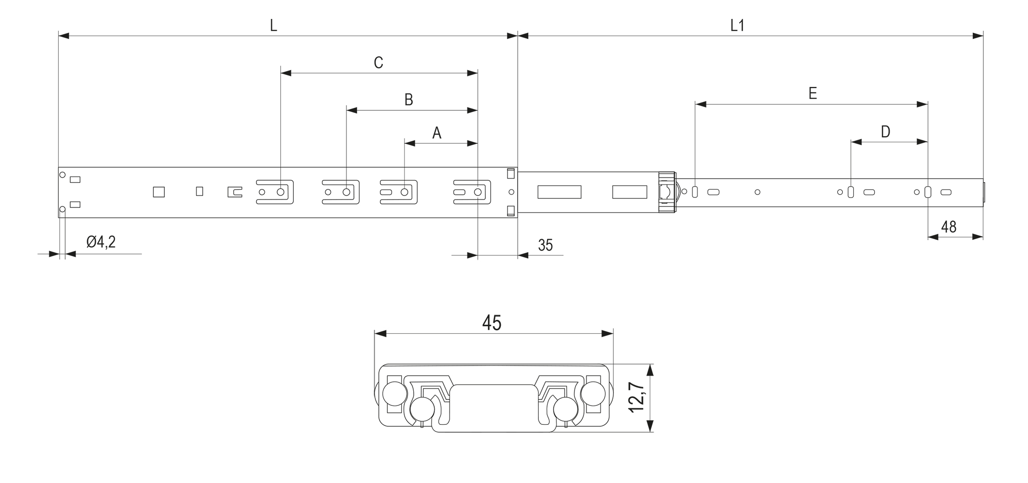A fióksínek névleges hossza és terhelhetősége a termék nevében szerepel. A fiókhosszabbítás hossza körülbelül 310 mm, a fiókhosszabbítási veszteség körülbelül 35 mm.