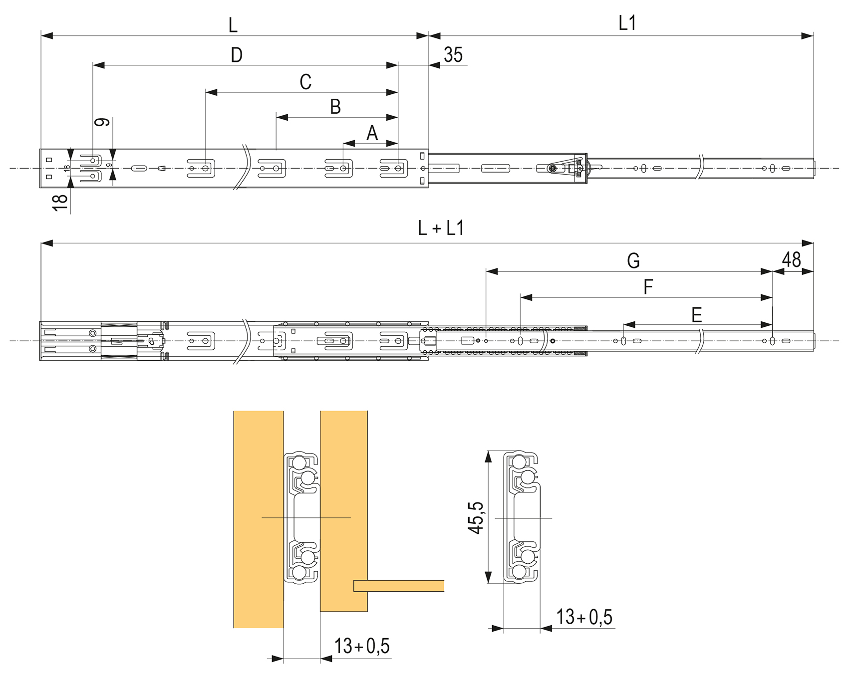 | Sín vezetésének módja | Teljes kihúzású fióksín |