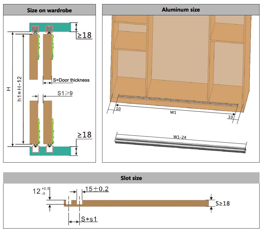 Tolóajtós szekrény vasalat készlet, teherbírás 40 kg/ajtó, készlet két ajtóhoz. A vezetősínek 1,5 m, 2 m és 3 m hosszban elérhetők, lásd az alábbi kapcsolódó termékeket. Ajánlott minimális szárnyszélesség – 500 mm, magasság <2500 mm a 3:1 arány (magasság:szélesség) betartásával. A készlet tartalma: 4x csillapító, 8x görgő, 4x alsó ütköző, 32x facsavar, 1x imbuszkulcs. Szerelési útmutató: