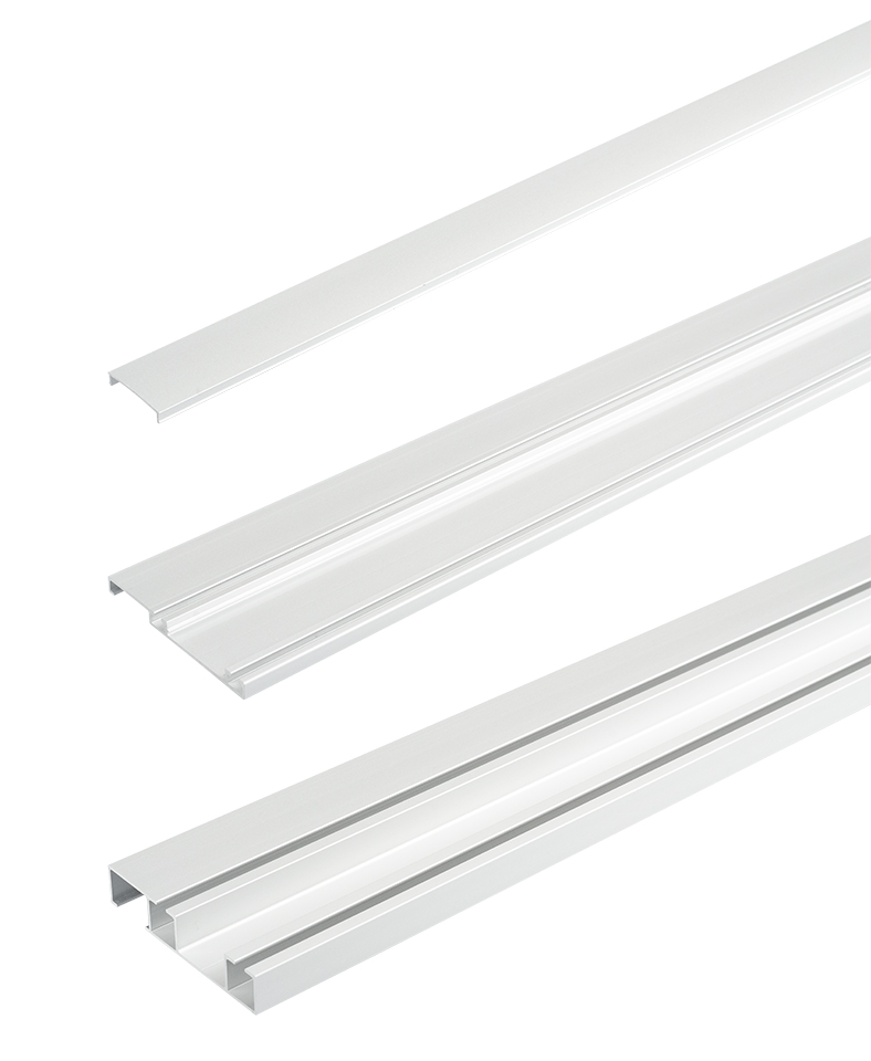 Felső és alsó vezetősínből álló készlet takaróprofillal. Hossz: 2 m. Felületkezelés: ezüst eloxált.