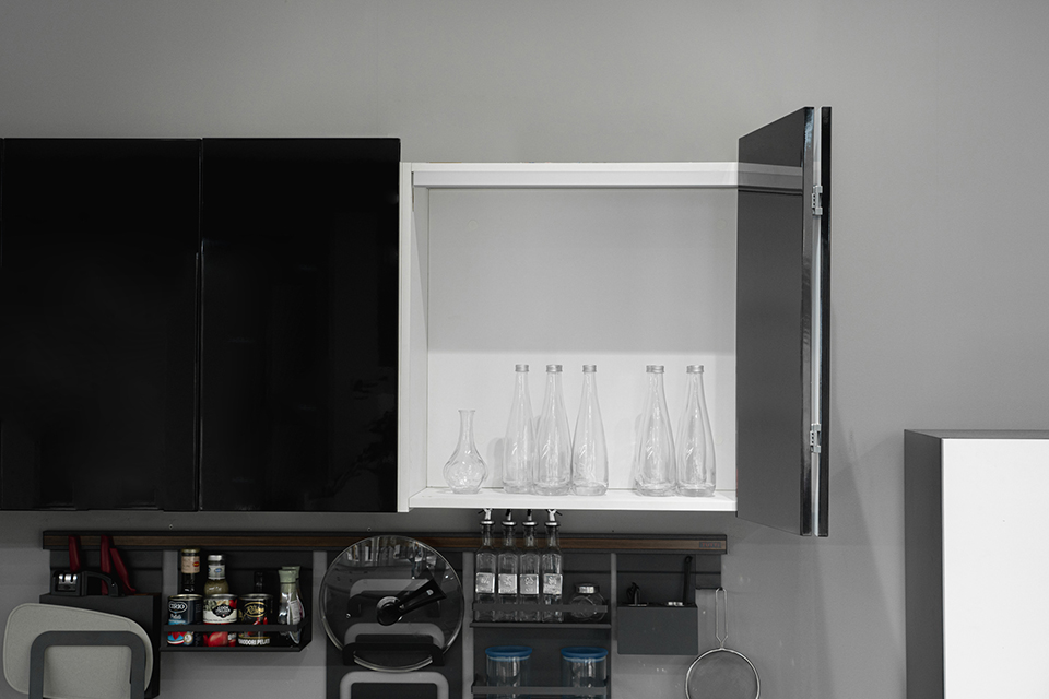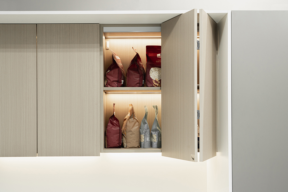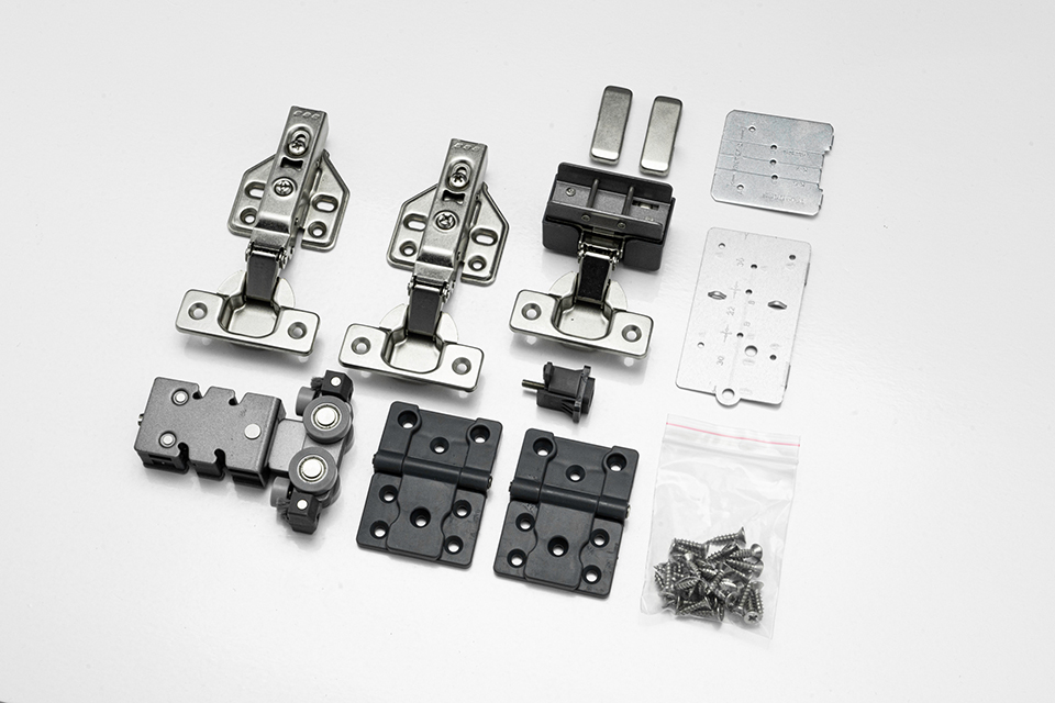 Kétszárnyú, ráütődő harmonikaajtó-vasalat készlet alsó vezetés nélkül. Egy szárny maximális mérete: 500 × 1200 mm. Anyagvastagság: 18–25 mm.