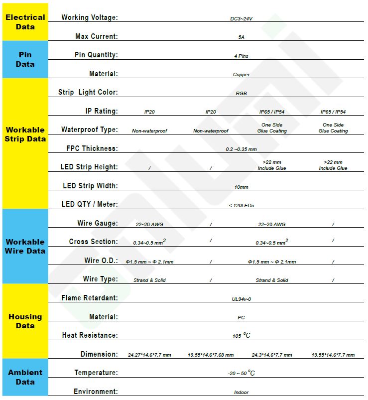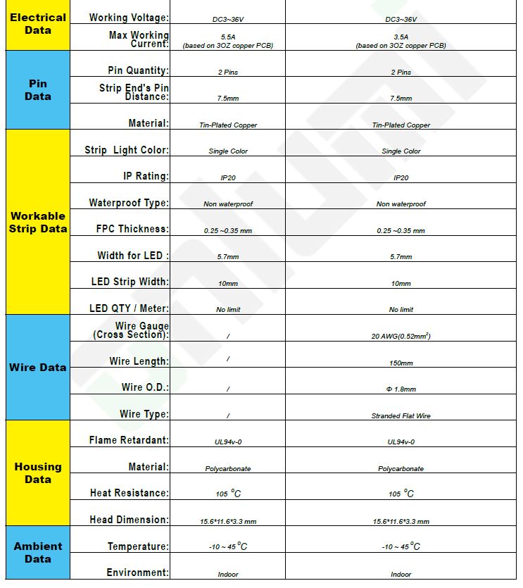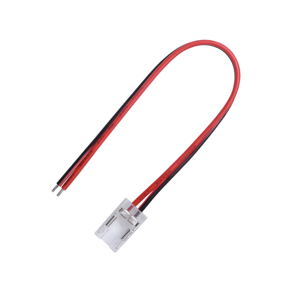 Egy 10 mm széles, egyszínű LED szalag és más berendezések (transzformátor, kapcsolótábla, vezérlőegység stb.) csatlakoztatására. Másik kábel csatlakoztatásához Wago bilincset vagy csatlakozóblokkot kell használni, lásd a kapcsolódó választékot. Kábel hossza - 150mm.