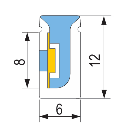 Horizontální ohýbání - do stran při svitu směrem nahoru. Integrovaná plastová výztuha pro zajištění vyšší odolnosti. Typ LED diody - 1515. Barva světla: teplá bílá (+- 3000 K). Index podání barev (CRI) Ra>90. Šířka: 6mm. Výška: 12mm. Výkon: 9,6W/m. Počet diod: 168/m. Světelný tok: 250 lm/m. Napětí: 24V stejnosměrné. Stupeň krytí: IP67. Baleno v rolích po 30m, rozbalitelnost po 1m (lze krátit v označených místech co cca 41,7mm, v těchto místech lze i opětovně propojovat). Připojování pomocí kabelu viz. Související sortiment.