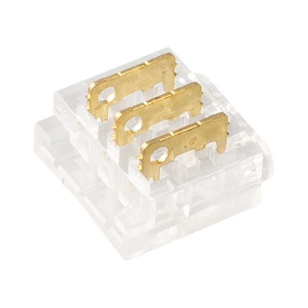 Spojka pro spojení CCT LED pásek - kabel (trojlinka). Vhodné pro LED pásky šířky 10mm viz. související sortiment. Spojka se na LED pásek nasadí a pomocí kleští se přitlačí kontaktní trny do LED pásku, kdy se trny poté do LED pásku zaříznou. Spojka je tedy určena pro jedno použití. Pro použití v profilech o min. šířce 12mm a výšce 5,1mm.