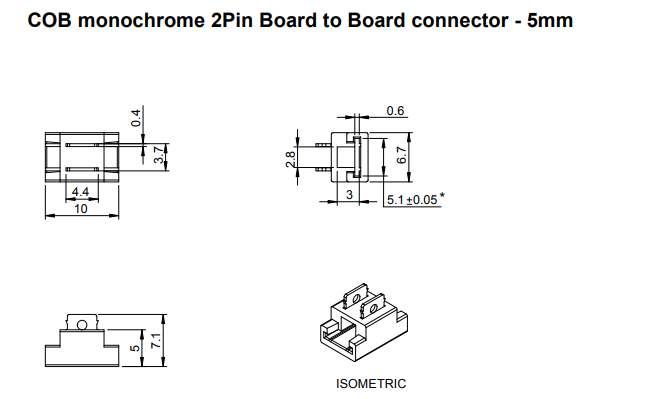 Spojka pro spojení COB LED pásek - LED pásek. Vhodné pro LED pásky šířky 5mm viz. Související sortiment. Spojka se na LED pásek nasadí a pomocí kleští se přitlačí kontaktní trny do LED pásku, kdy se trny poté do LED pásku zaříznou. Spojka je tedy určena pro jedno použití. Pro použití v profilech o min. šířce 7mm a výšce 5,1mm.