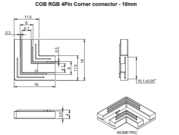 Rohová spojka pro spojení CCT/RGB COB LED pásek - LED pásek. Vhodné pro LED pásky šířky 10mm viz. Související sortiment. Spojka se na LED pásky nasadí a pomocí kleští se přitlačí kontaktní trny do LED pásku, kdy se trny poté do LED pásku zaříznou. Spojka je tedy určena pro jedno použití. LED pásky se musí v místě vnitřního rohu překrývat viz. foto. Pro použití v profilech o min. šířce 12mm a výšce 5,1mm.
