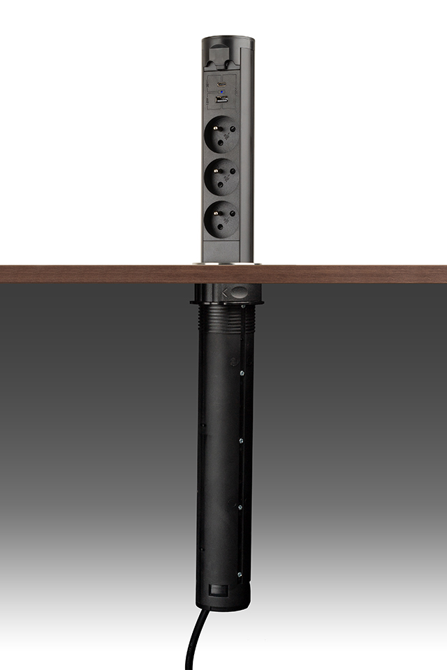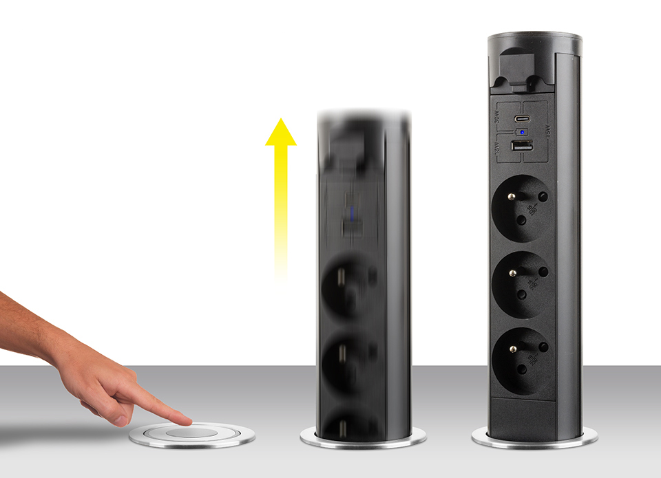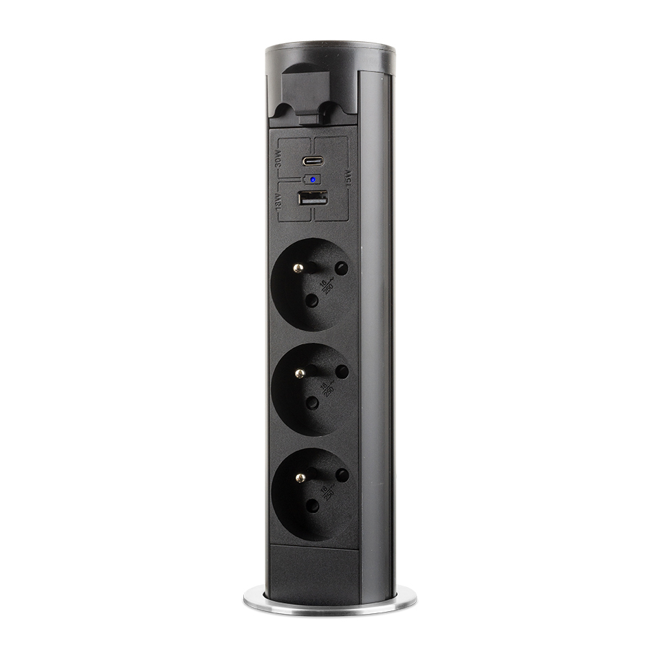 StrongPower elektromos kihúzható aljzat 3x 230V francia, USB A+C fekete