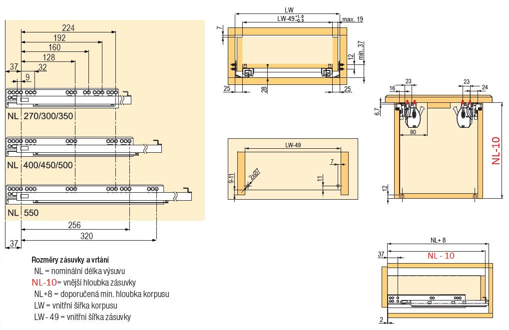 Rejtett, teljes kihúzású fiók a fából készült fiókokhoz, szinkronizált középső résszel, az elülső klipszekkel együtt. Anyagvastagság legfeljebb 19 mm. Nagy stabilitás, a fiók teljes hosszában szilárd és sima futás. A fiók nagyon hosszú élettartama még teljes terhelés mellett is (legalább 60 000 ciklus). Intelligens termék: csendes és stabil a szinkronizálásnak köszönhetően, nem zavarja a fiókot nyitáskor, 3 irányban állítható. Fiók hossza = NL-10. Névleges hossza 400 mm, teherbírása 40 kg.