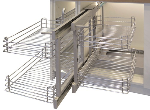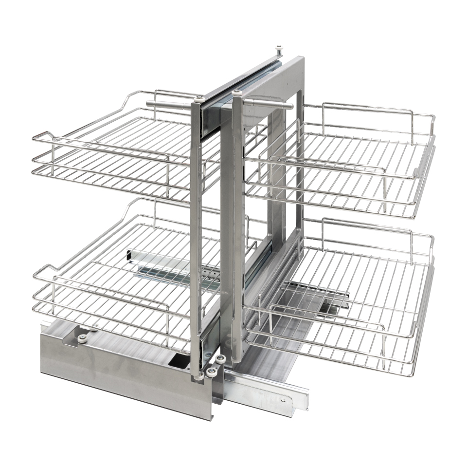 Univerzális (jobbos-balos) mechanizmus alsó sarok megoldásra, 900-1000 mm külső korpusz méretre. A hátsó kosarak kitolódnak a korpusz elé. Méret: szélesség 762, mélység 540, magasság 610 mm. A front minimális szélessége 450mm. A zárásnál nem csillapít. Minimális belső mélység 521 mm. Az egyes polcok teherbírása = 5 kg