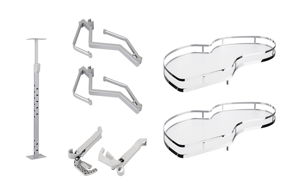 2 db kihúzható polcból álló készlet az alsó sarokszekrényhez. A bal oldali változat túlcsillapítással történő záráskor. 900 mm-es szekrényszélességhez