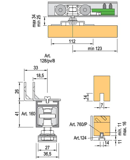 Beltéri tolóajtókhoz való szerelvények 160 kg-ig. 5 profilrögzítővel együtt. megfelelő vezetőprofil = DT305-7 (2-3-6m).